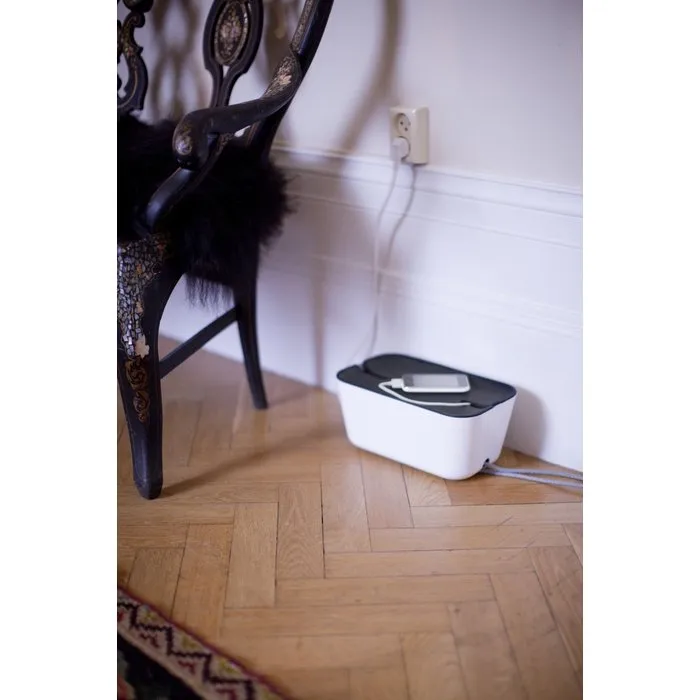 Cable Organiser Hideaway collects all chargers and hides cables from different electronic equipment such as cell phones, iPads and digital cameras in a tidy way. With Hideaway is a great way to avoid tangled cables, both at home and in your office. It is also a great way to store all of your chargers in one place. Hideaway is designed with carefully considered details such as a lowered anti-slip lid where all items lie safely and which provides a delicate storage place. Hideaway has feet made of silicone for stability and to prevent scratches on floors, shelves or tables. The bottom of the drawer has ventilation holes and the material is fireproof. The lid is designed with a click function to keep cords, chargers etc. in place. With its simple and pure design, it is decorative and easy to reach.