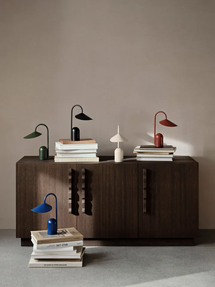 Arum portable lamp from Ferm Living is made of powder-coated iron and aluminium, giving it a smooth and durable finish. This small, portable LED lamp is rechargeable via USB-C, allowing you to create a cosy atmosphere wherever you are. The lamp has a petal-shaped shade that appears to float from the lamp base, providing an elegant balance. It also has a three-step touch dimmer for adjustable ambient lighting.