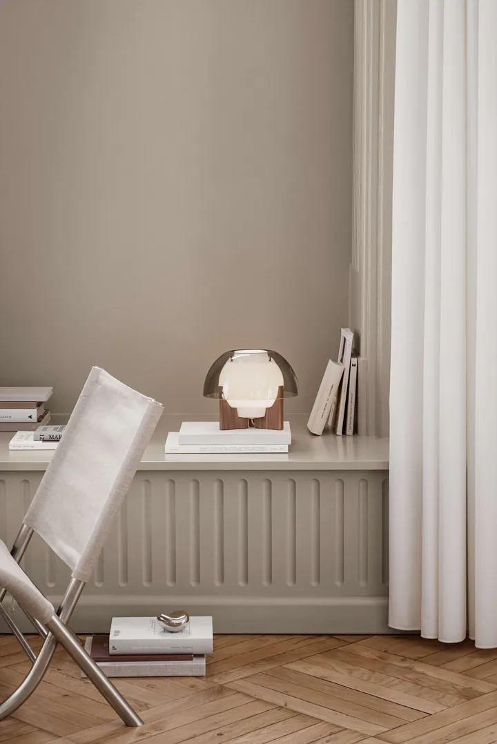 Ergo desk lamp is made of three-layer opal glass and a high-quality wooden base in walnut or oak. This charming lamp, designed by Bent Karlby in 1971, creates a pleasant lighting and adds a lot of character wherever it is placed.