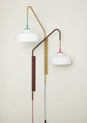 Current vägglampa från Hübsch är en iögonfallande belysningslösning som verkligen fångar blicken. Med sitt djärva formspråk och unika färgkomposition kompletteras den av en opal rundad glasskärm, vilket ger en intressant kontras. En perfekt belysningslösning för den som söker något utöver det vanliga i både design och funktion.