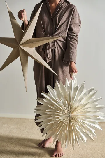 Bare adventsstjärna natur från svenska Scandi Living är en enkel och stilren stjärna tillverkad i vitt papper klädd med tyg i linnelook. Den stora pappersstjärnan har ett elegant och klassiskt formspråk och sprider ett varmt och stämningsfullt ljus. Placera adventsstjärnan i fönstret så både du och de som går förbi kan njuta av pappersstjärnans magiska sken.