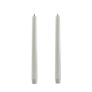 Taper LED-ljus 2-pack Ø2,3x25 cm från Uyuni Lighting är elegante LED-stearinljus som skapar varm stämning utan sot eller rök. Den patentsökta 3D-flamman ger ett naturligt, mjukt flimmer och den vaxliknande ytan förstärker det äkta uttrycket. Varje ljus har inbyggd 6 h timer och över 200 h batteritid med 2 x AAA-batterier. Tillverkade i ABS för hållbarhet och säkerhet. Perfekt för dukningar, fönster och ljusstakar där du vill ha tryggt ljussken. Kompatibla med Uyuni fjärrkontroll för timer 4–10 h och tre dimmernivåer. Oparfymerade och flamfria.